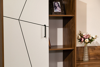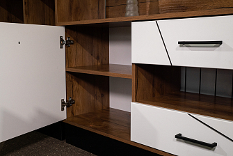 Шкаф взяли для гостиной. Смотрится стильно и современно, без лишних деталей. Экономит пространство и в тоже время очень вместительный: есть выдвижные ящики внизу и шкафы с распашными дверцами для одежды справа и слева. Цена вполне демократичная. Оплачивали наличными при получении, но можно было и онлайн заранее на сайте. С доставкой проблем не было.