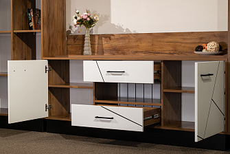 Стенка очень красивая. Ничего лишнего. Выбор пал на нее по приницу отсутствия времени и минимального наличия открытых полок (в данной стенке только под телевизор открытая), стильного дизайна в стиле минимализма. При покупке и сборке самостоятельно, учитывайте, что сверлить дырки для крепления верхних ящиков к боковым стойкам придется самостоятельно. Никакой разметки не предусмотрено, что соответственно в техническом плане оставило не очень хорошие впечатления. Со сборкой пришлось хорошенечко поковыряться (сами собираем заказанную в дом мебель и никогда таких проблем не возникало). Производителю порекомендую заранее просверливать эти дырки, т.к. на производстве в заготовках это сделать проще, чем когда уже сборка идет к этапу "завершение" и сталкиваешься с таким не приятным сюрпризом.