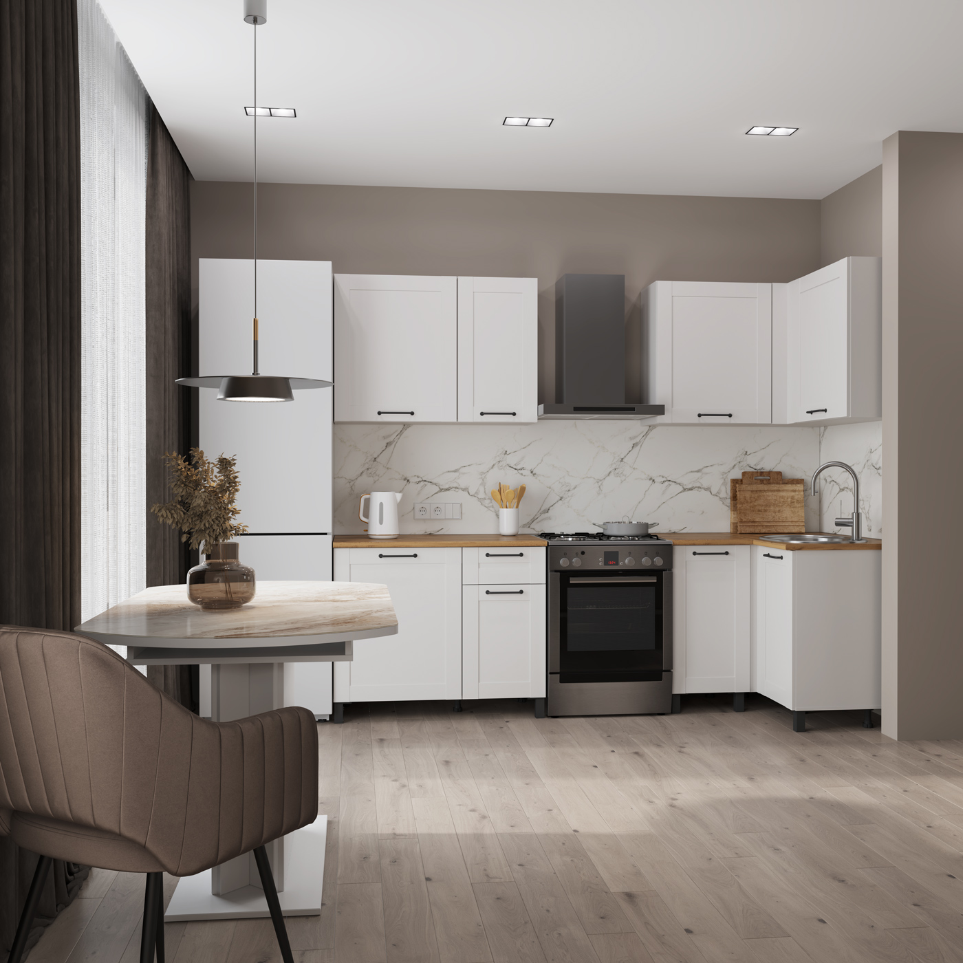 Кухня Аризона (угол) (белый / столешница: дуб вотан / ДВПО: белый / ПВХ софт белый 0,3мм / профиль: ПВХ белый О) совмещает благородную привлекательную эстетику с практичностью и хорошим функционалом. Продуманный дизайн уместно дополнит созданный интерьер и органично впишется в любое помещение.