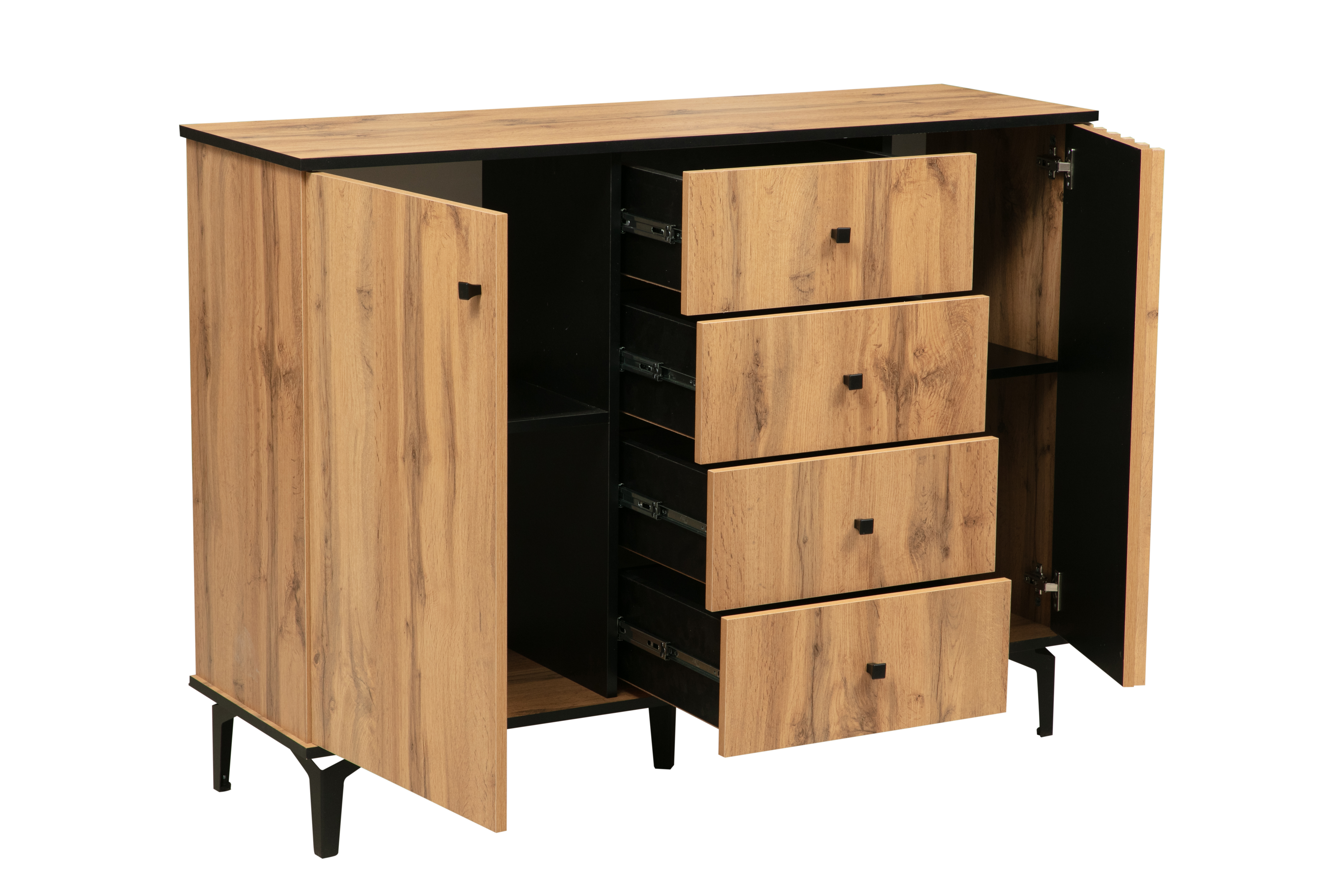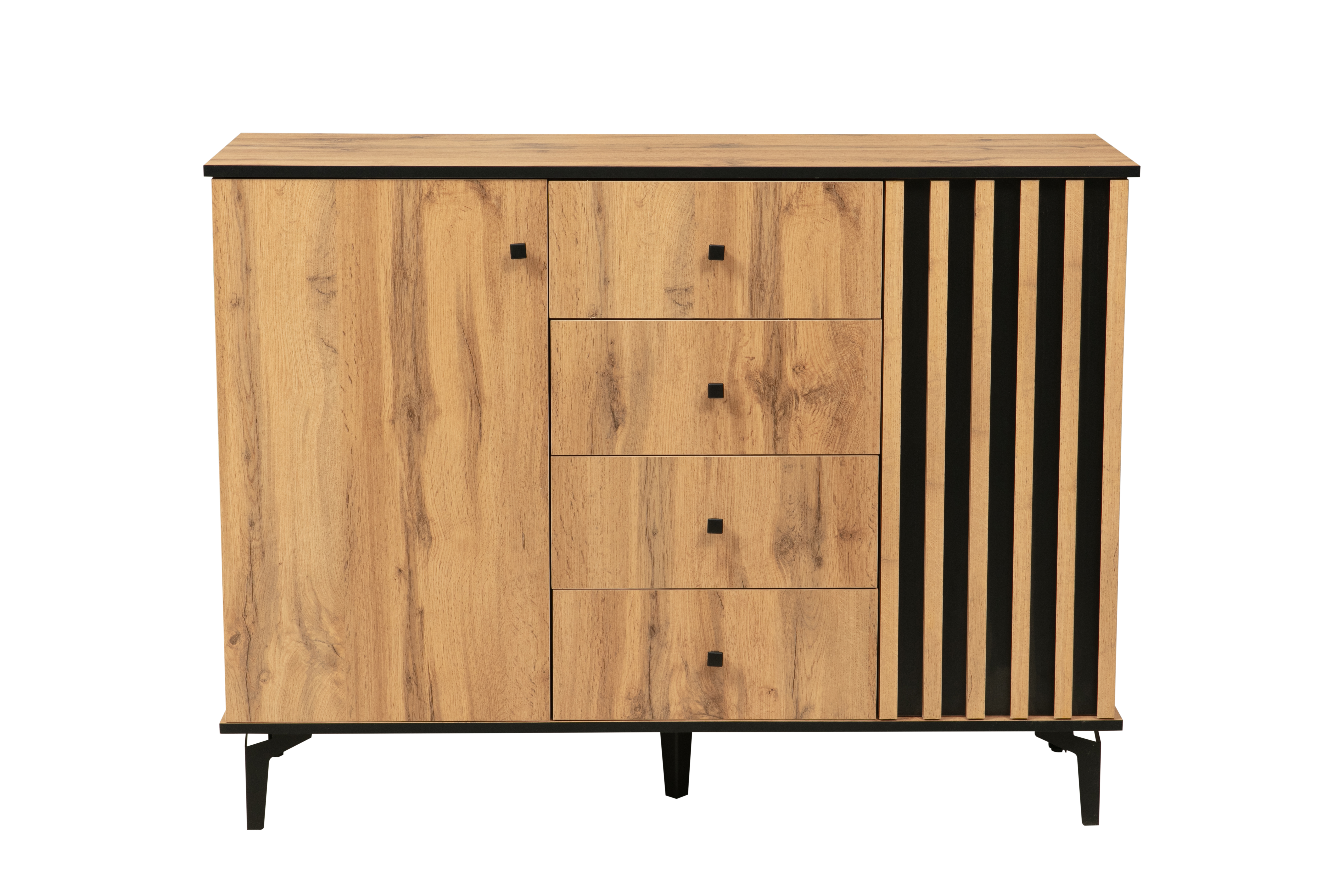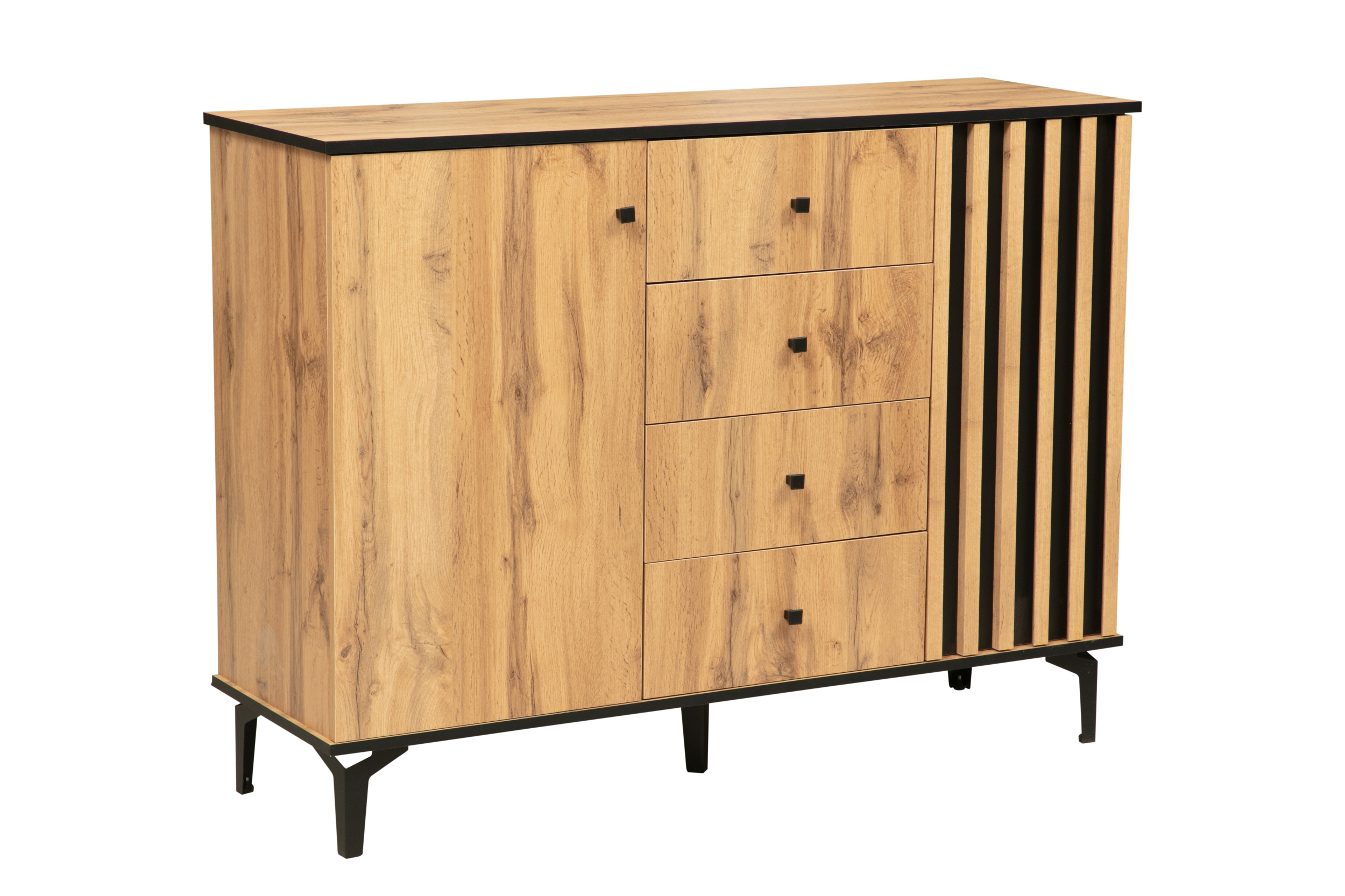 Комод 51.04 Либерти (опора метал. h=150мм) # (дуб вотан / черный / профиль: Masa Decor дуб вотан) исполняется в классическом стиле и спокойных цветах. Модель сочетает в себе простоту и функциональность, но при этом не выглядит громоздко. Она гармонично впишется в пространство, не утяжеляя его.